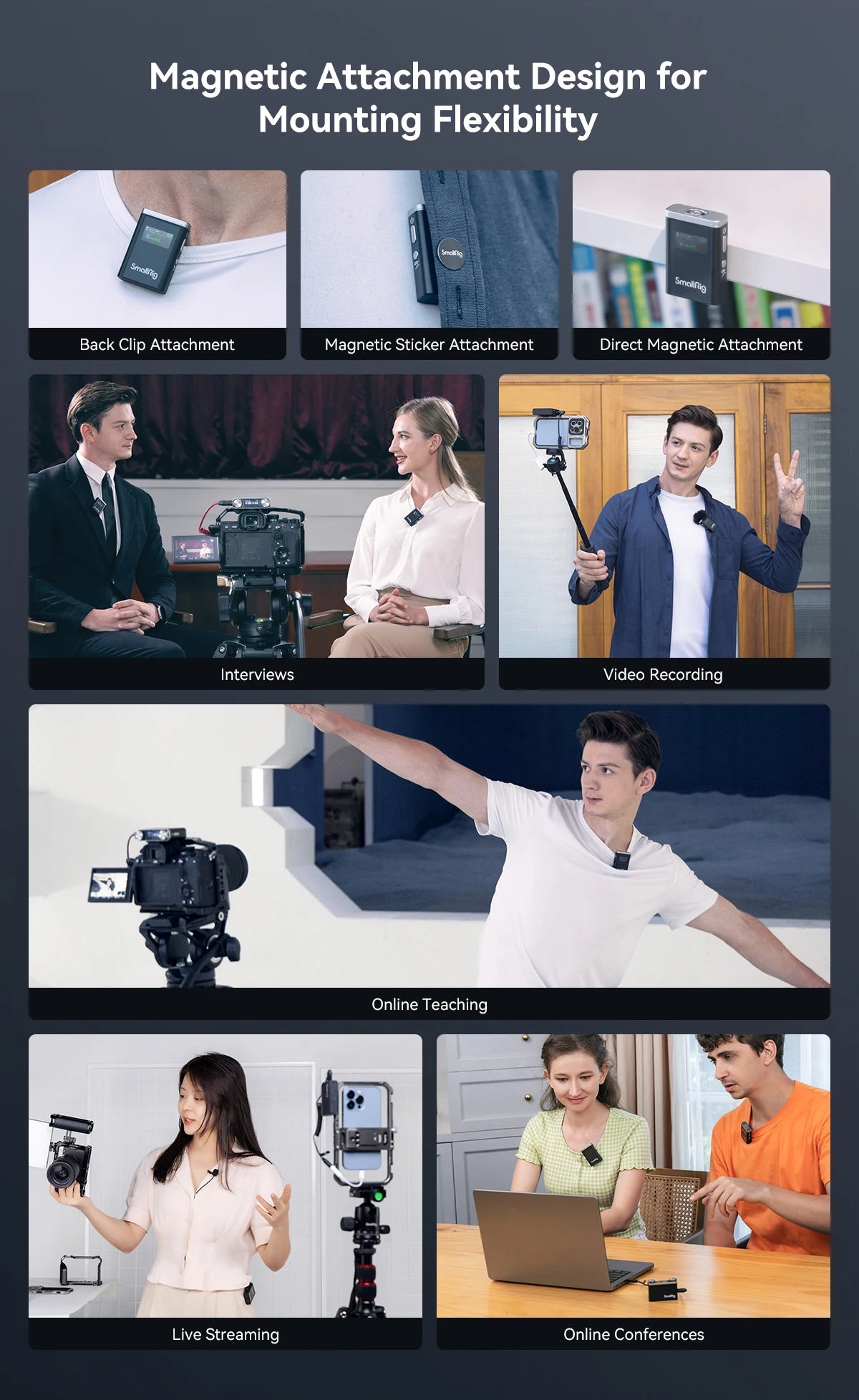 SmallRig Forevala W60 is a 2.4G wireless microphone with low-latency audio transmission and a must-have for photo and video enthusiast. Featuring industry-leading DSP for noise and sound processing, it supports such gears as smartphones, cameras, stabilizers, action cameras, computers, recorders, video cameras, recording pens, tablets to deliver professional quality recordings.